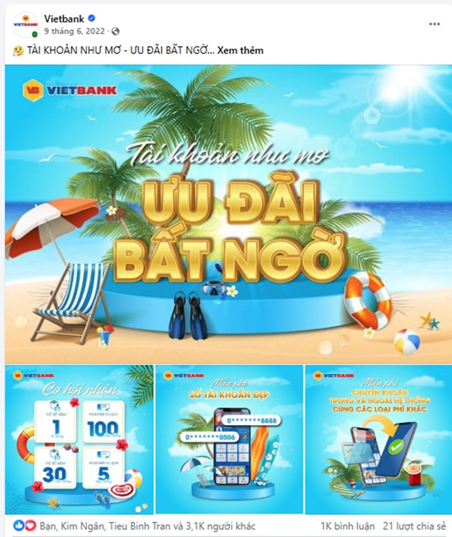Hè năm 2022, Việt Nam trở lại “bình thường hóa” sau thời gian dài bị ảnh hưởng bởi dịch Covid-19. Vietbank mong muốn khuyến khích khách hàng tận hưởng mùa hè sôi động bên người thân và bạn bè thông qua chương trình khuyến mãi “ Vietbank: Vi vu hè mới – Quà tới trao tay ” với các phần thưởng hấp dẫn.